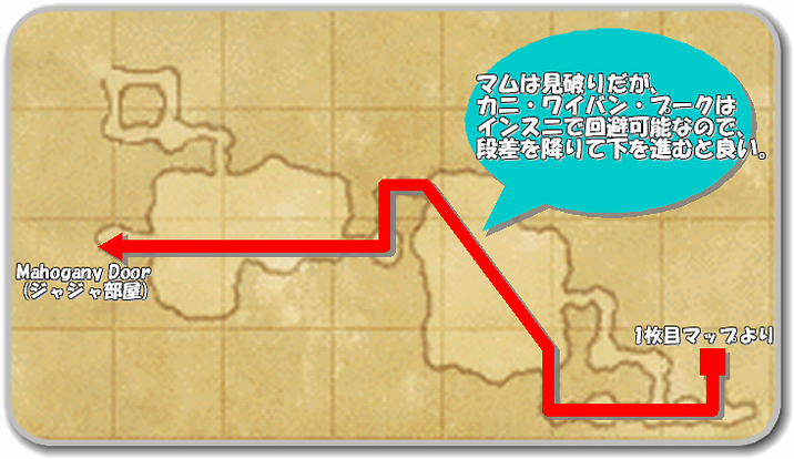 2枚目マップに入ると、上のマップに出るので、同じ様に赤ルートを進み「Mahogany Door」へ。