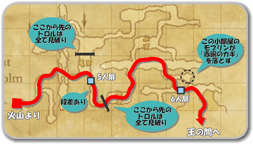 王の間に行くには上図の赤いルートを通って行けば良いのですが、マップを見て解る様に