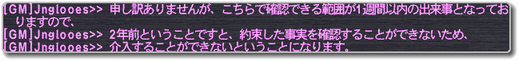 "事件"(詐欺等発覚)から一週間では無理で、"貸し借り"から一週間じゃないと無理とか。GMに相談するぐらいなのはレリック等作る資金だったりで比較的高額になってくるため、それはつまりもちろん普通に返そうとしても半年や一年かかるのが普通でしょう(すぐ稼げる場合は借りないだろうし)。毎週(貸し借り)ログ流せるならいいですが、それもちょっとアレですし。基本的に高額持ち逃げはどうしようもないんですよね…