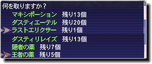 中身は6種類固定で、回復系薬品3種 + その他3種といった感じ。